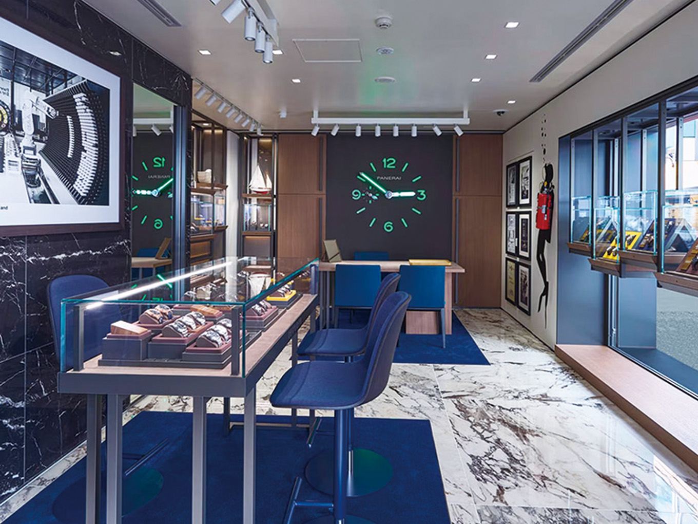 存在感のある大きいケースのイメージが強いパネライだが、よりドレッシーで扱いやすい38㎜~40㎜サイズもあるため、自分に合うモデルを探すには実際に手に取ってほしい。パネライの世界観を具現化した「パネライ 広島ブティック」では、多彩なコレクションのみならず歴史や哲学にも触れることができる。2023年にリニューアルした店内では、ラグジュアリーな雰囲気の中に大型のウォールクロックや空気ボンベに見立てた消火器など、随所にパネライのエッセンスが満載。豊富なストラップからお気に入りを選択し、カスタマイズすることも可能だ。洗練されたデザイン、機能性、そしてストーリー。変革を取り入れながらも、独自のアイデンティティを貫くパネライ。個性を表現し、自分を高める一本としていかがだろう。