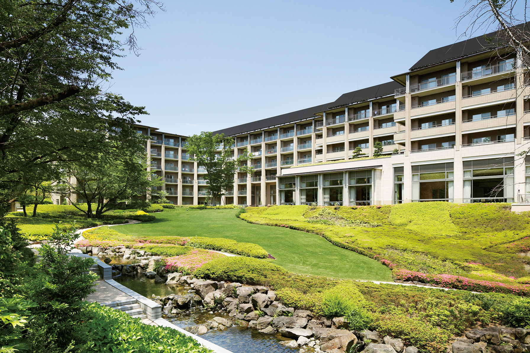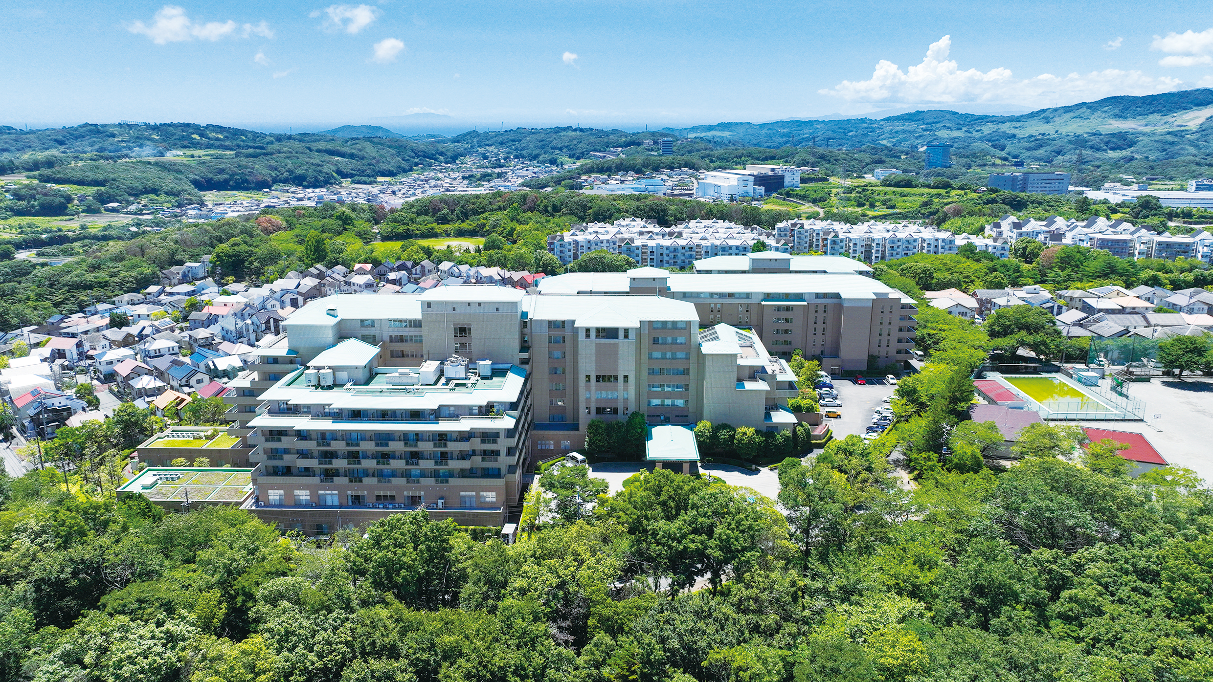 美しい中庭を目の前にする『サンシティ横浜』は、面積にして実に約2万5000坪という壮大なスケールの敷地に静かに佇む。横浜の中心部から車で15分、もとは「カーリットの森」と呼ばれた広大な雑木林で、その緩やかな起伏を活かした設計がドラマティックな印象を演出している。