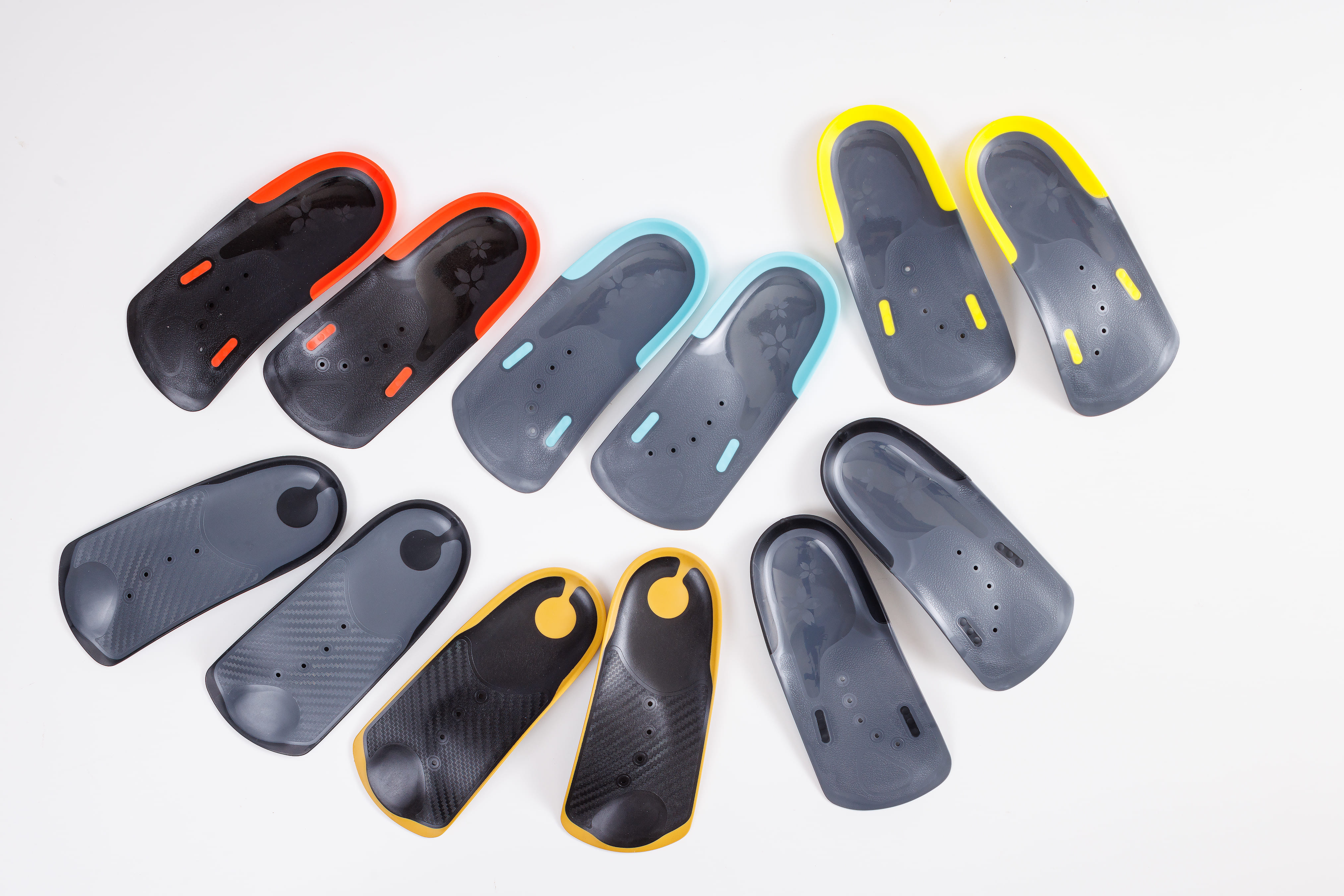 同社ではアメリカ・ドイツのオーダーインソール技術を研究し、その性能を量産型で再現。独自の「ダブルインジェクション製法(2色成形)」によって、硬い素材による安定性と軟らかい素材による快適性を両立させた高性能ハーフインソールを製造販売している。