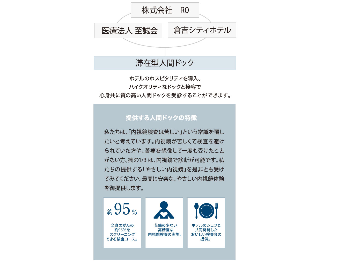 倉吉シティホテルと倉吉シティ内視鏡クリニックを組み合わせた、地域観光も楽しめる宿泊付きのハイクオリティ人間ドックを行う。ここでは、誰もが受診したくなるホテルクオリティのサービスを提供。