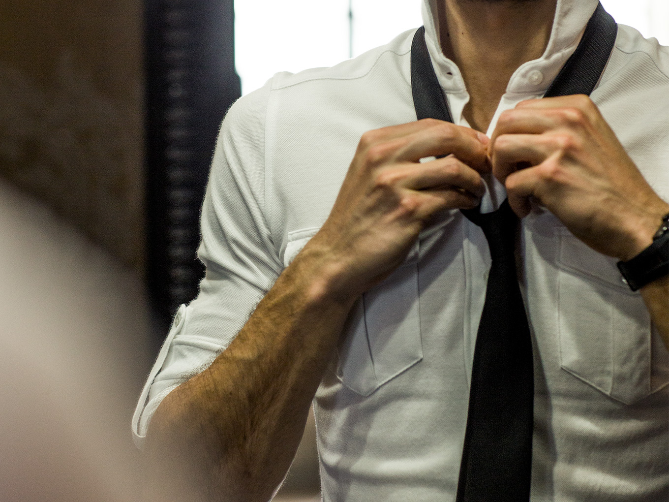 最新の機能性素材ということで速乾性や防臭性も十分な新・パイロットシャツでは、2系統のシリーズが展開された。まず、平行に見えるよう計算された胸ポケットをはじめ、ビジネス現場での逞しさを表現するパイロットシャツ。そして、ミニマルなデザインが生地の滑らかさを際立てる、ややフォーマルなドレスシャツ。いずれも実用的なので、オフィスワークと商談や接待など、シーンに応じて使い分けたい。