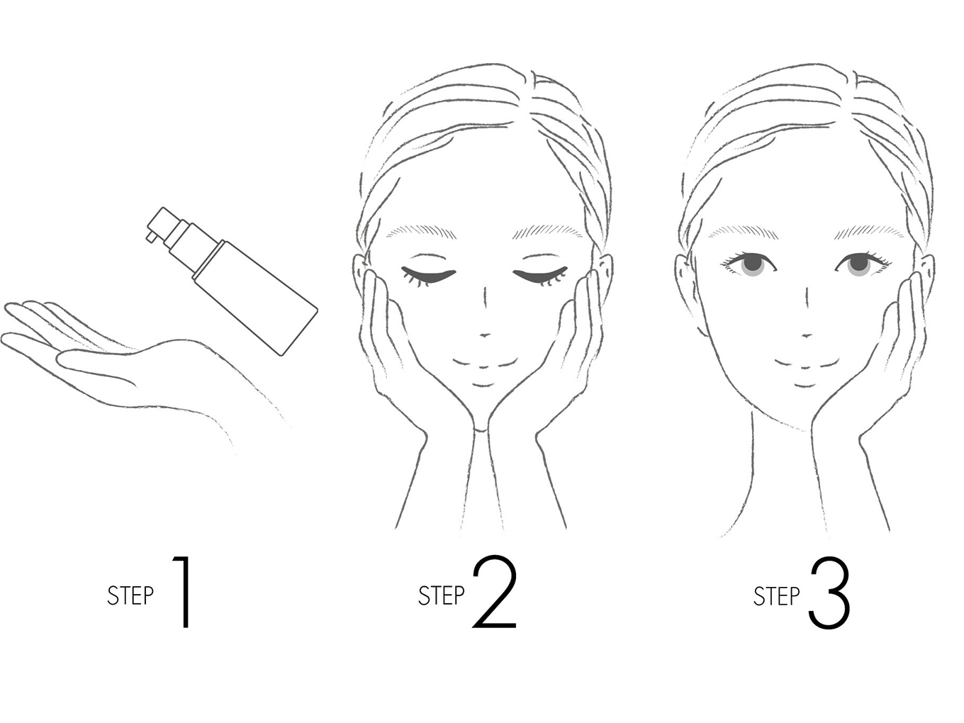 洗顔直後、1回につき2〜3プッシュ分を手に取り、手のひらで顔全体包むようにやさしく馴染ませる。手のひらに肌が吸いつくようになったら、いつものお手入れを開始。