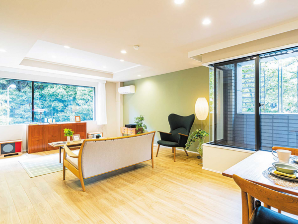 現地は丘の上の高級住宅街で、瀟洒な5階建て。雁行型の建物は、最初からそこに存在していたかのように景観に溶け込んでいるが、それもそのはず、もとは長期滞在者向け住宅として建てられたものなのだ。施工は鹿島建設株式会社で、株式会社ラ・アトレがレジデンスとしてリノベーション。1990年創業のラ・アトレは、新築分譲マンションから商業施設、ホテル、オフィスビルの開発まで多角的に扱うデベロッパーで、その豊富な実績とノウハウは物件のバリューアップに存分に活かされている。